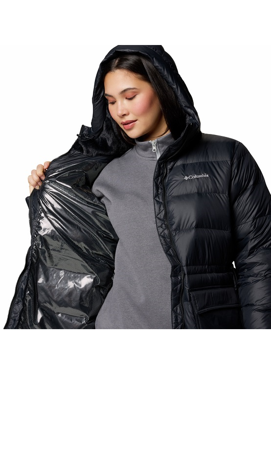 Columbia Harmony Falls™Mid Down Jacket – moteriška šilta, stilinga, lengva, funkcionali, vidutinio ilgio pūkinė striukė su gobtuvu sukurta tam, kad apsaugotų nuo vėjo, drėgmės bei šalčio kasdienėmis sąlygomis. Puikus pasirinkimas miestui ir žiemos kelionėms.