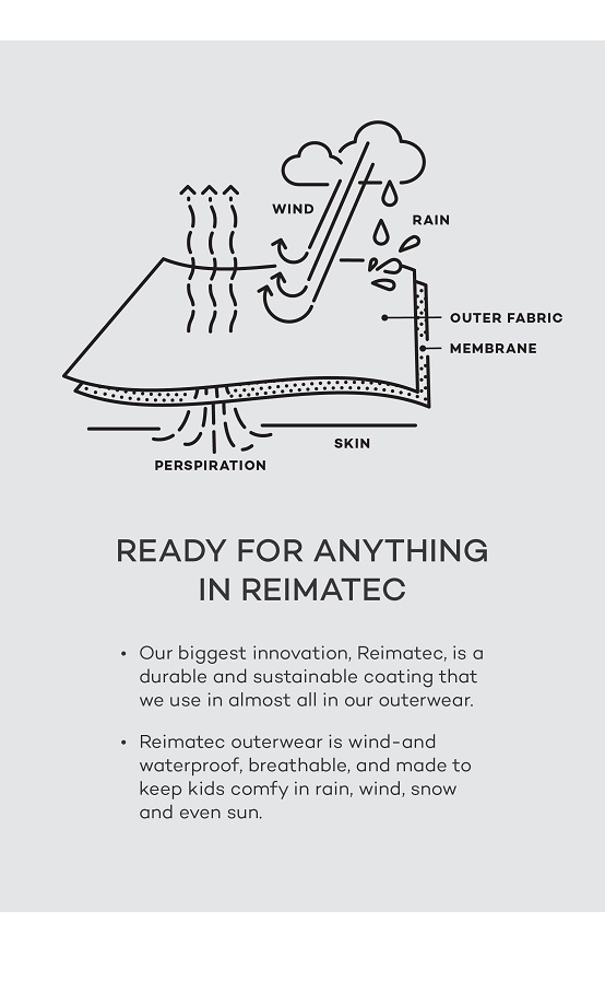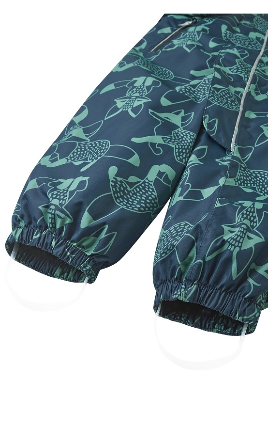 Reimatec® kombinezonas Puhuri – pagamintas iš vėjui nepralaidžios, bet kvėpuojančios medžiagos, kuri atstumia purvą ir drėgmę.
